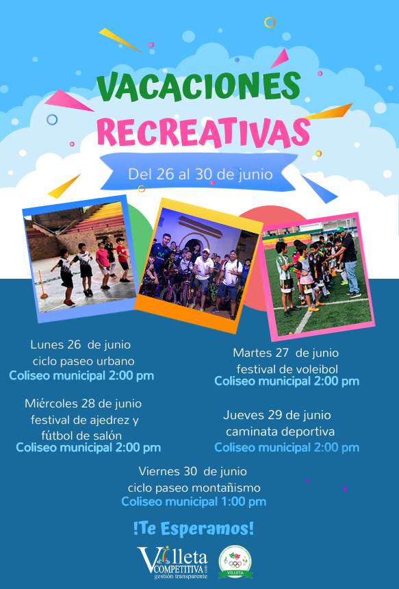 La Administración Municipal en cabeza de nuestro Sr alcalde Freddy Hernández y el IMTCRD liderado por la directora Alexandra Patricia Iregui González invitan a todos los niños y niñas a participar de las vacaciones recreativas que tenemos programadas.