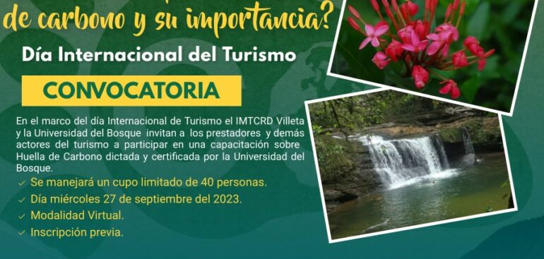 La Alcaldía Municipal, el IMTCRD y la Universidad del Bosque, le invitan a ser parte de un curso sobre Huella de Carbono como parte de la celebración del convenio 002-2023 entre la Universidad del Bosque y el IMTCRD, cuyo objeto es: «AUNAR ESFUERZOS TÉCNICOS, LOGÍSTICOS Y FINANCIEROS ENTRE UNA ENTIDAD SIN ANIMO DE LUCRO (ESAL) Y EL INSTITUTO MUNICIPAL PARA EL TURISMO, LA CULTURA, LA RECREACIÓN Y EL DEPORTE DE VILLETA CON EL FIN DE FACILITAR LA REALIZACIÓN DE ACCIONES PARA FORMULAR UN PROYECTO CON FINES TURÍSTICOS Y DE CONSERVACIÓN AMBIENTAL PARA LA QUEBRADA CUNE Y SALTO DE LOS MICOS QUE PERMITA GESTIONAR LA DECLARATORIA DE ESTE RECURSO TURÍSTICO COMO UN ATRACTIVO TURÍSTICO CONFORME LO ESTABLECE EL DECRETO 190 DEL 2022 DE LA NUEVA LEY DE TURISMO 2068 DEL 2020”